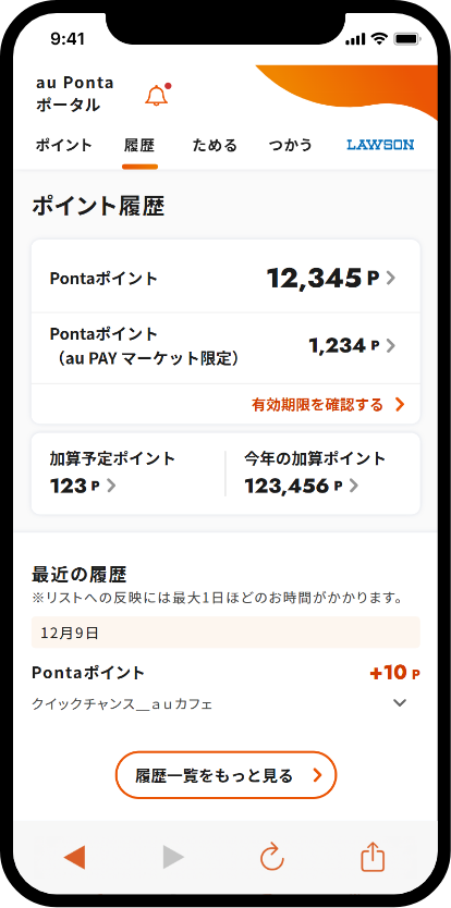 ポイントの履歴・予定、これまでの加算累計数や有効期限を確認することができます。また、ポイントがたまる・つかえるauのサービスやキャンペーン情報など、知りたい情報が集まっています。